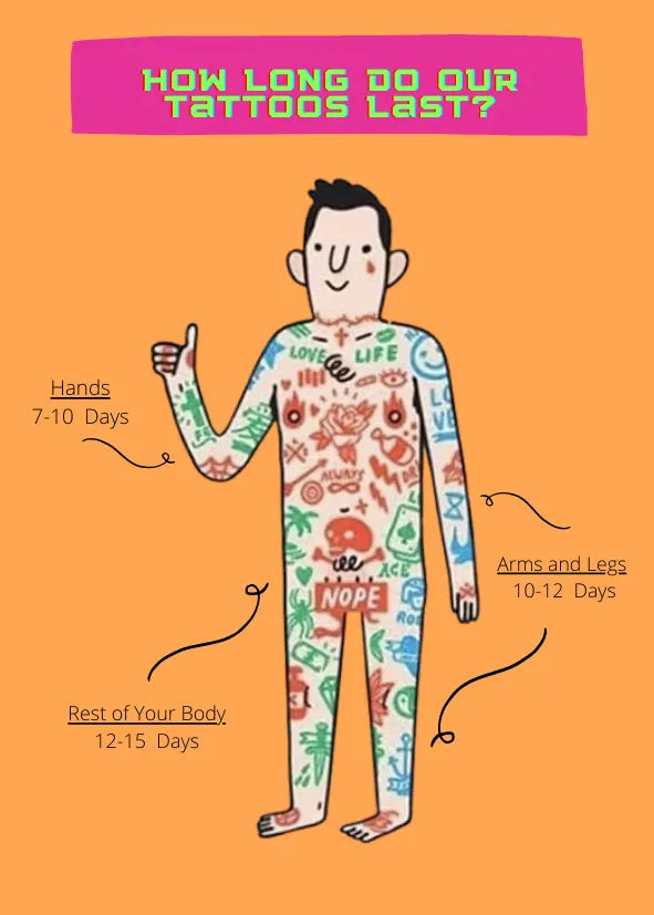 Jagua Tattoos age differently of the different parts of your body. For example, your hands get much more wear on them from washing hands all the way to working, so on these parts of the body temporary tattoos last the shortest period of time.